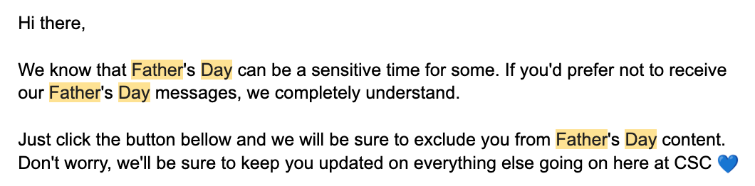 If I’m wrong, and there is someone on the brand team is dead dad-qualified, I would tell them to bffr. Send a list of potential triggers that first time grievers get to look forward to this Father’s Day! Very fun! Very unique! It could go something like this…